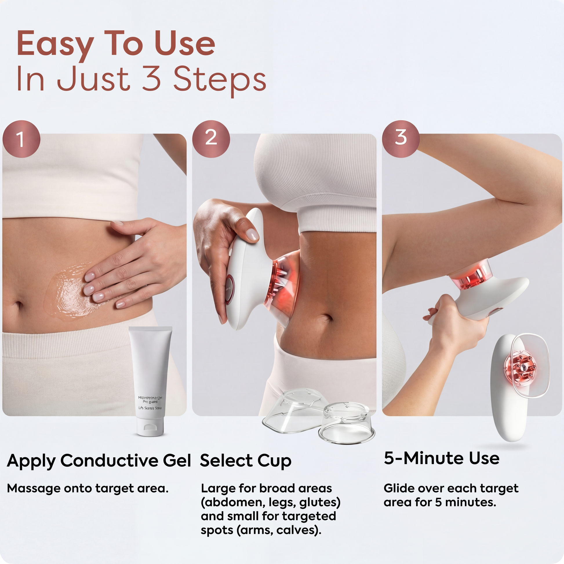The lymphatic drainage effect is real. After just a few minutes I can see my skin looking less puffy and more even. I use it on my stomach, legs, and arms and the interchangeable cups make it easy to switch between areas. The conductive gel glides smoothly and gives a gentle tightening sensation. This has genuinely elevated my self-care routine in a way I didn't expect from an at-home device.